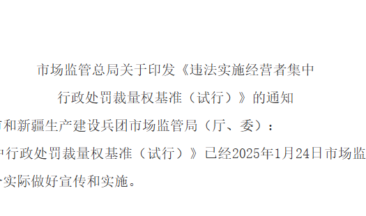 《违法实施经营者集中行政处罚裁量权基准(试行)》已经2025年1月24日市场监管总局第1次局务会议通过,现印发给你们,请结合实际做好宣传和实施。...
