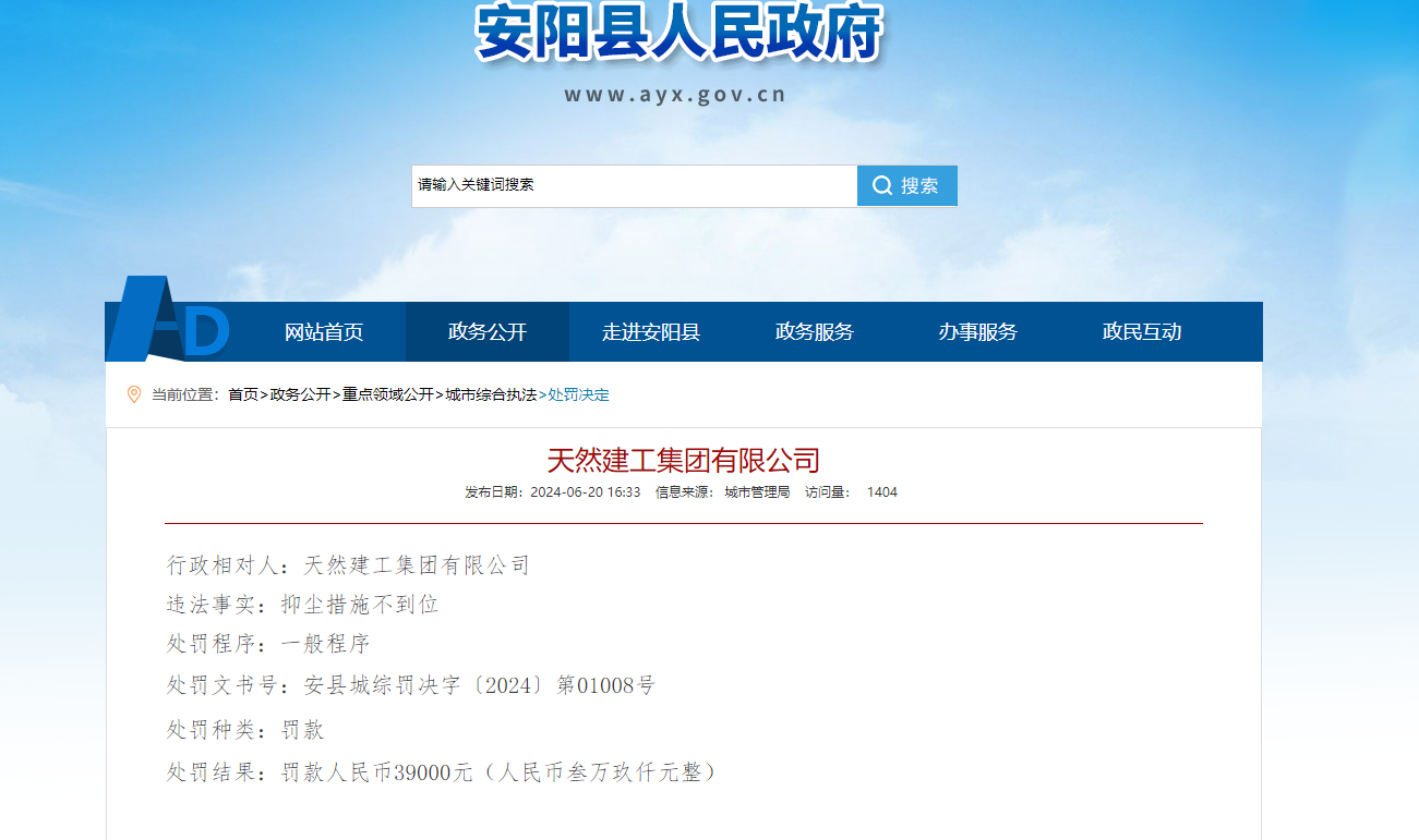 行政相对人:天然建工集团有限公司违法事实:抑尘措施不到位处罚程序:一般程序处罚文书号:安县城综罚决字(2024)第01008号